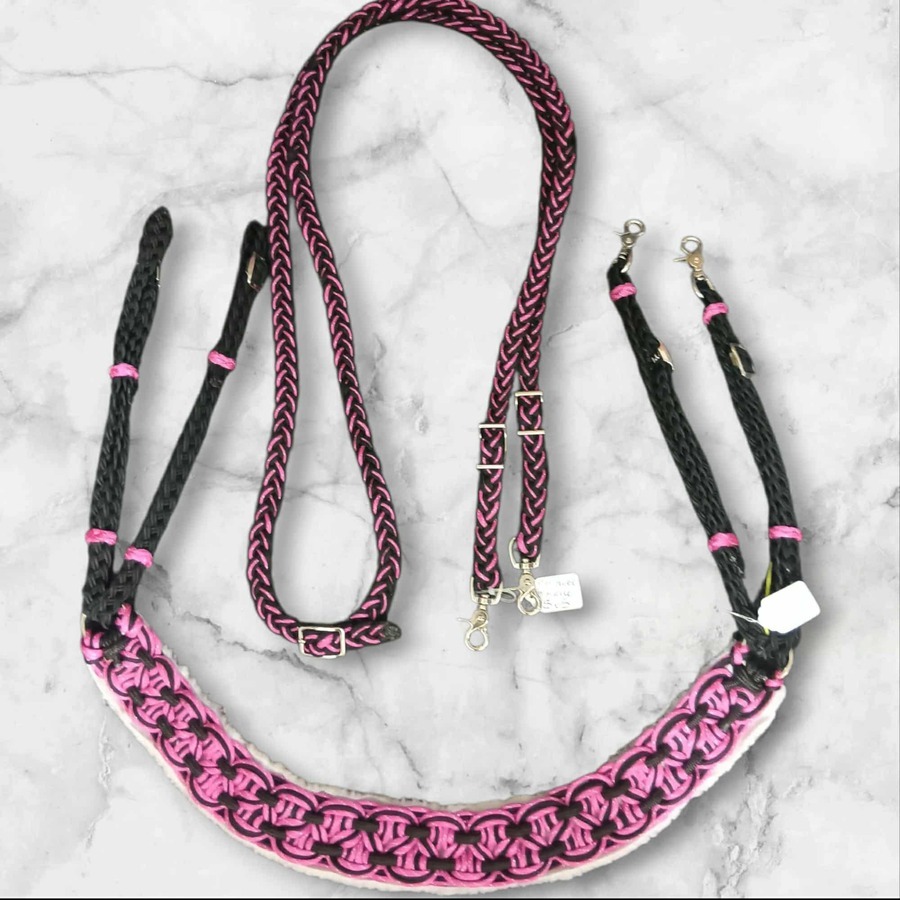 adjustable 9ft reins with center buckle and matching tripping breastplate with fluffy lining big pony/cob size