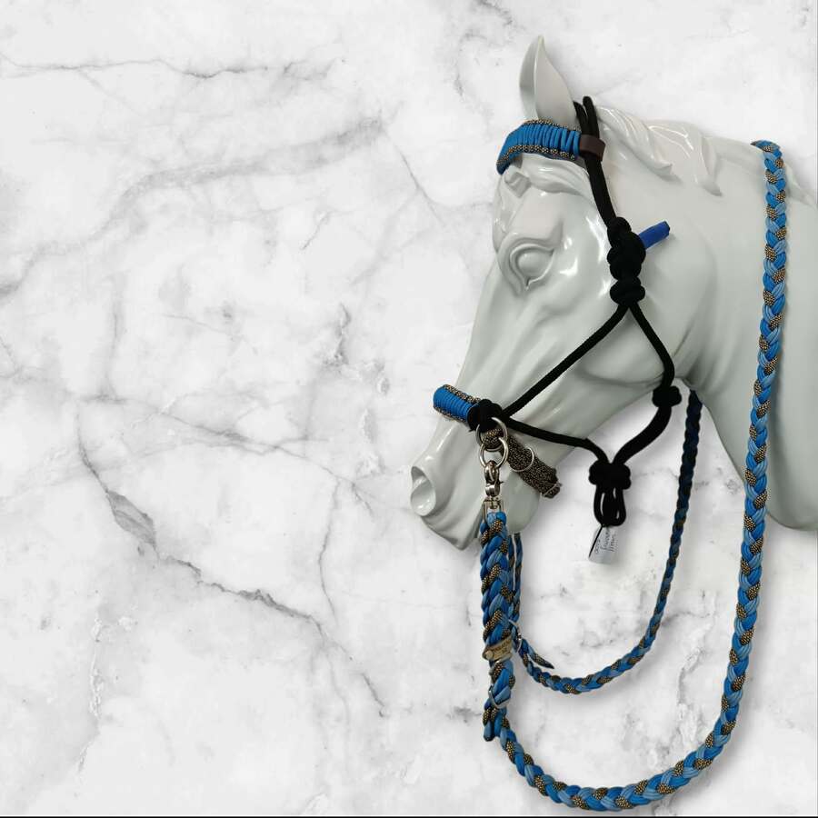 Between sml pony and pony size side pull rope bridle with chin strap and matching 7ft reins